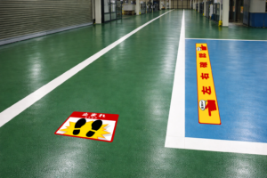 そのため、近年の工場では床サインによる止まれ表示の導入が増えています。