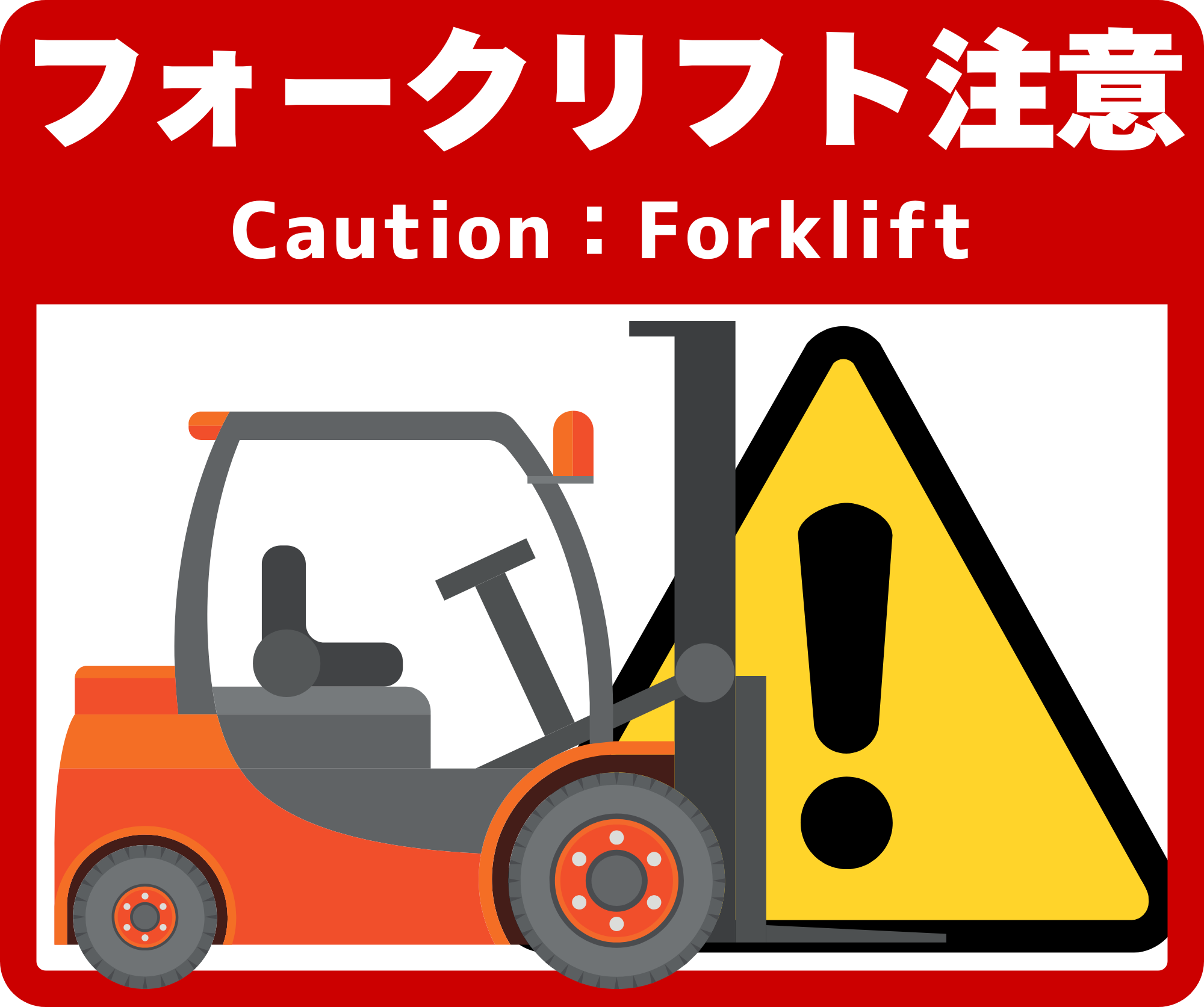 赤ベースの注意デザインに、フォークリフトの大きなイラストと